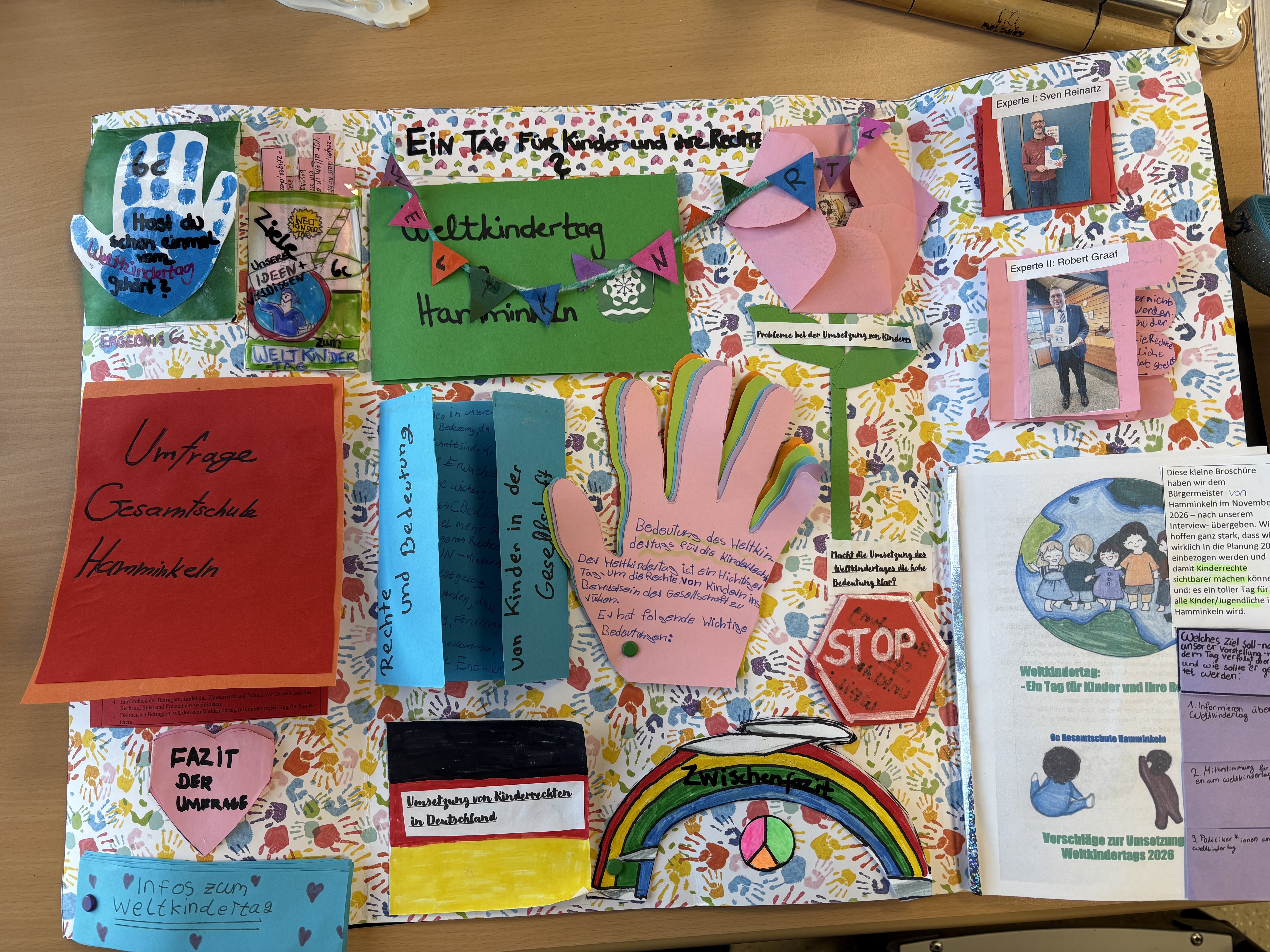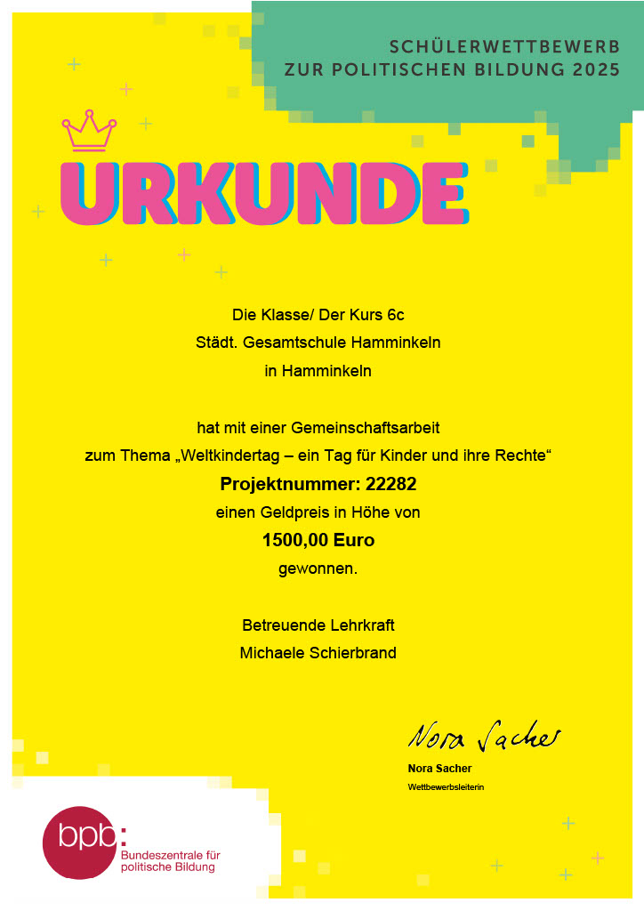 Die 6c erforschte, welche Rechte Kinder haben und wie diese in Deutschland umgesetzt werden. Dabei fanden die Schülerinnen und Schüler heraus, dass die Kinderrechte gemäß der UN-Kinderrechtskonvention in Deutschland insgesamt relativ gut umgesetzt werden, es aber noch Schwächen in den Bereichen Bildungsgerechtigkeit, Kinderarmut, Schutz vor Gewalt, Gleichbehandlung und Mitbestimmung gibt. Kritisch sah die Klasse, dass Kinderrechte bisher nicht im Grundgesetz verankert sind, und sandte daraufhin eine E Mail an das Kanzleramt in Berlin, in der sie um Unterstützung durch Bundeskanzler Merz bat. Im Anschluss recherchierte die Klasse, warum es den Weltkindertag überhaupt gibt und wie dieser bisher in Hamminkeln und Umgebung begangen wird, und reichte daraufhin weitere Umsetzungsideen für zukünftige Weltkindertage direkt bei Bürgermeister Robert Graaf ein, der sich zuvor von der Klasse interviewen ließ.